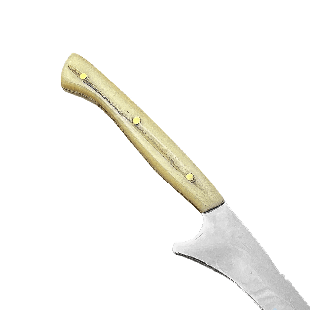 Cabo em osso bovino autêntico – cada peça é única, com textura natural que proporciona aderência segura mesmo com as mãos úmidas. O material nobre envelhece com elegância, desenvolvendo pátina característica ao longo do tempo.