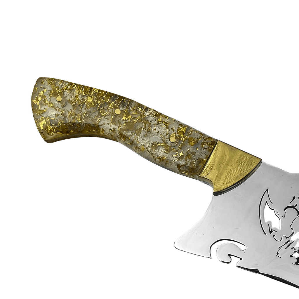 Cabo dourado com textura exclusiva – o acabamento em tons de ouro e prata cria um visual imponente e sofisticado. A textura trabalhada garante pegada firme e confortável, mesmo em uso prolongado.