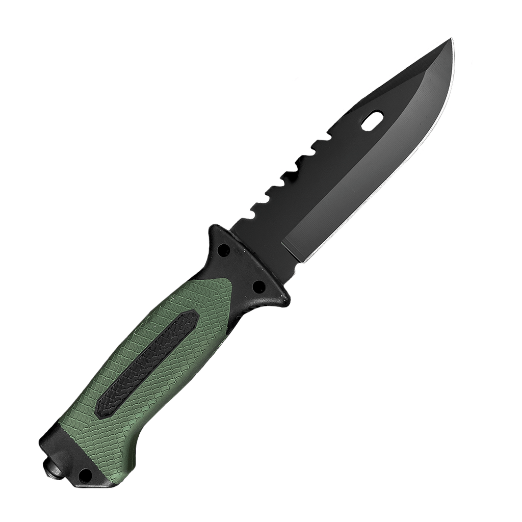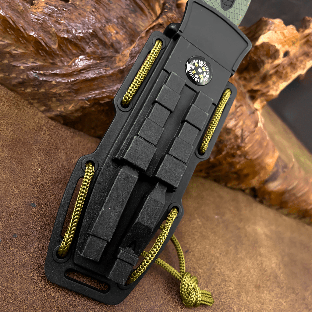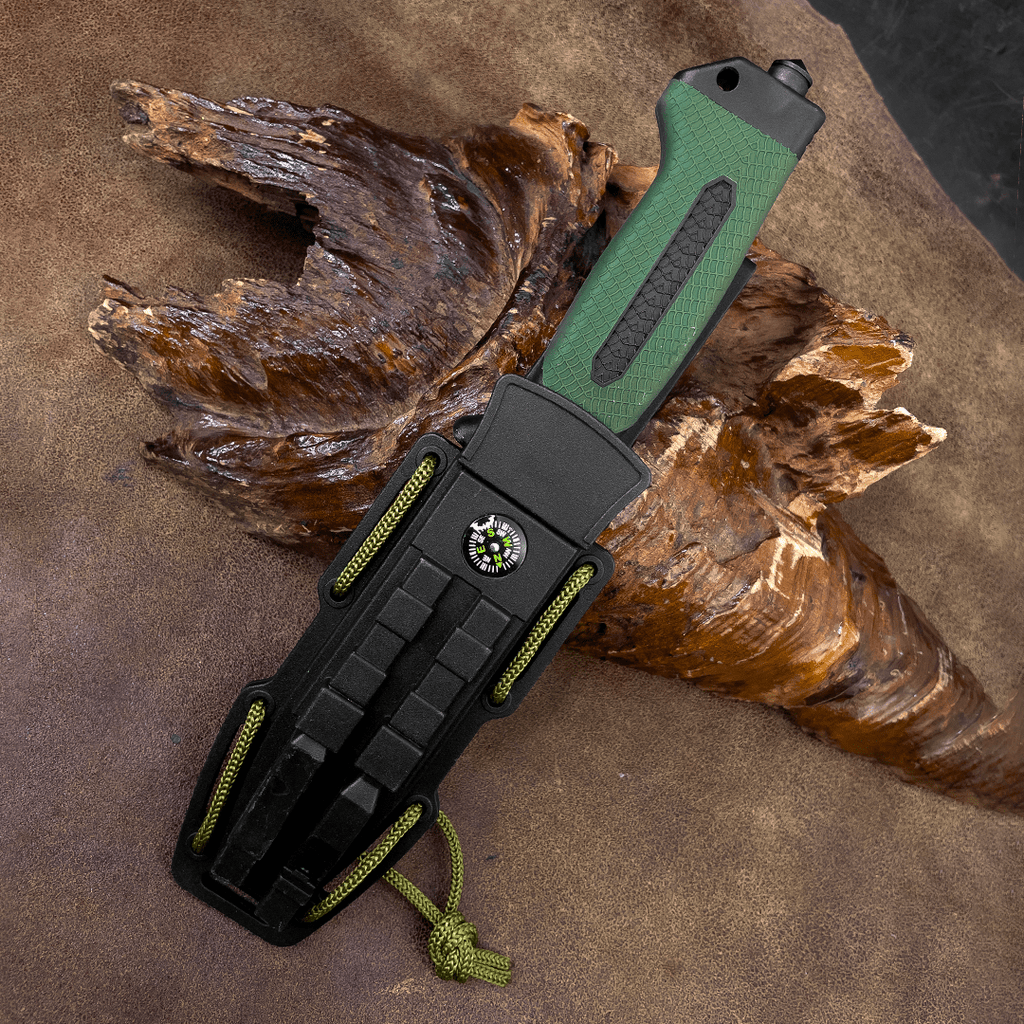 Faca Tática cabo verde musgo com quebra gelo + Bainha com bússola, pederneira e apito