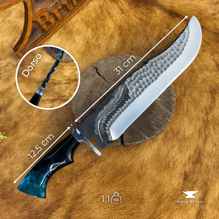 - Lâmina: 31 cm de aço forjado com textura tridimensional