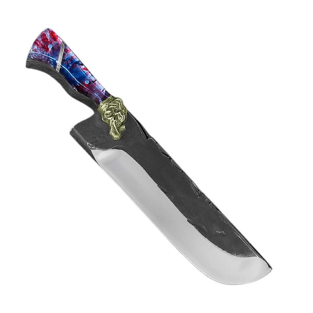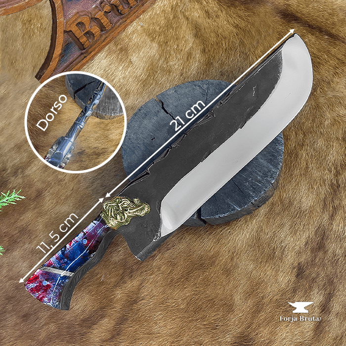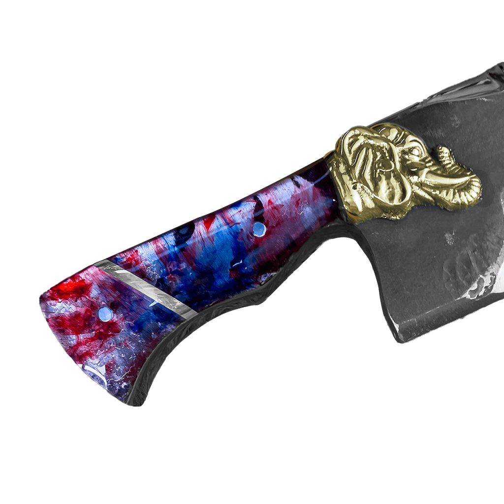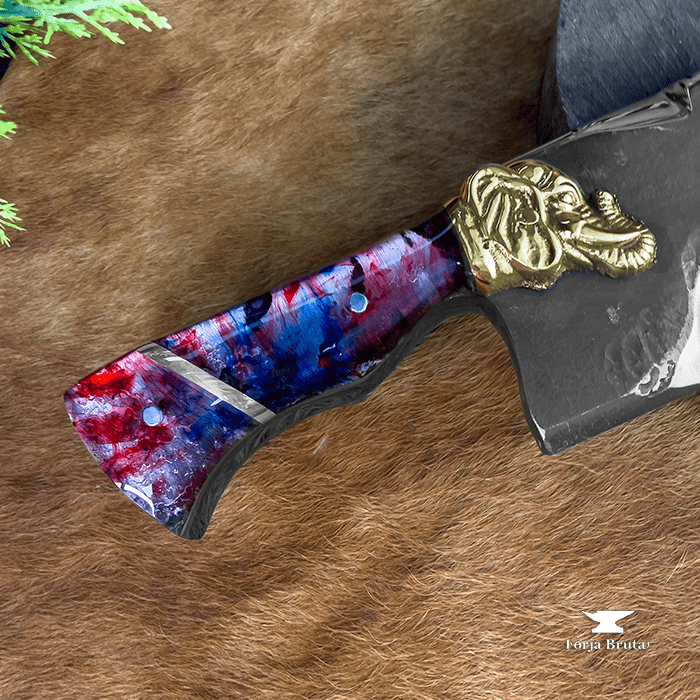Esta faca forjada artesanalmente representa a fusão perfeita entre arte e funcionalidade. O cabo em resina artística com tons de azul, roxo e vermelho cria um efeito visual hipnotizante, enquanto a cabeça de elefante em latão dourado adiciona sofisticação e simbolismo.