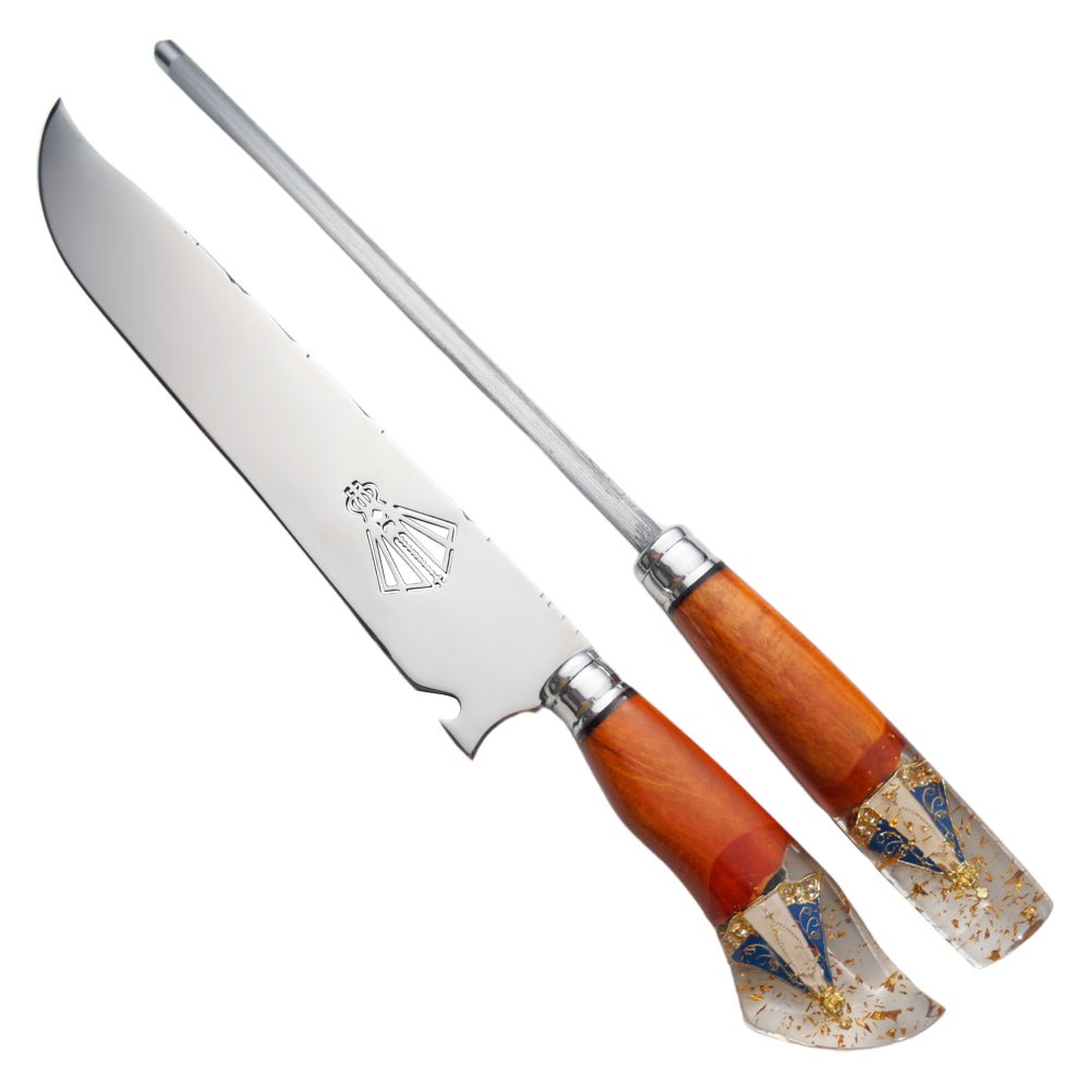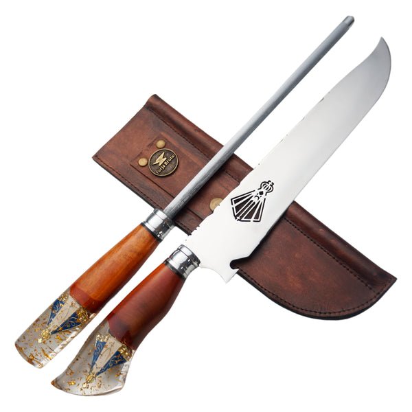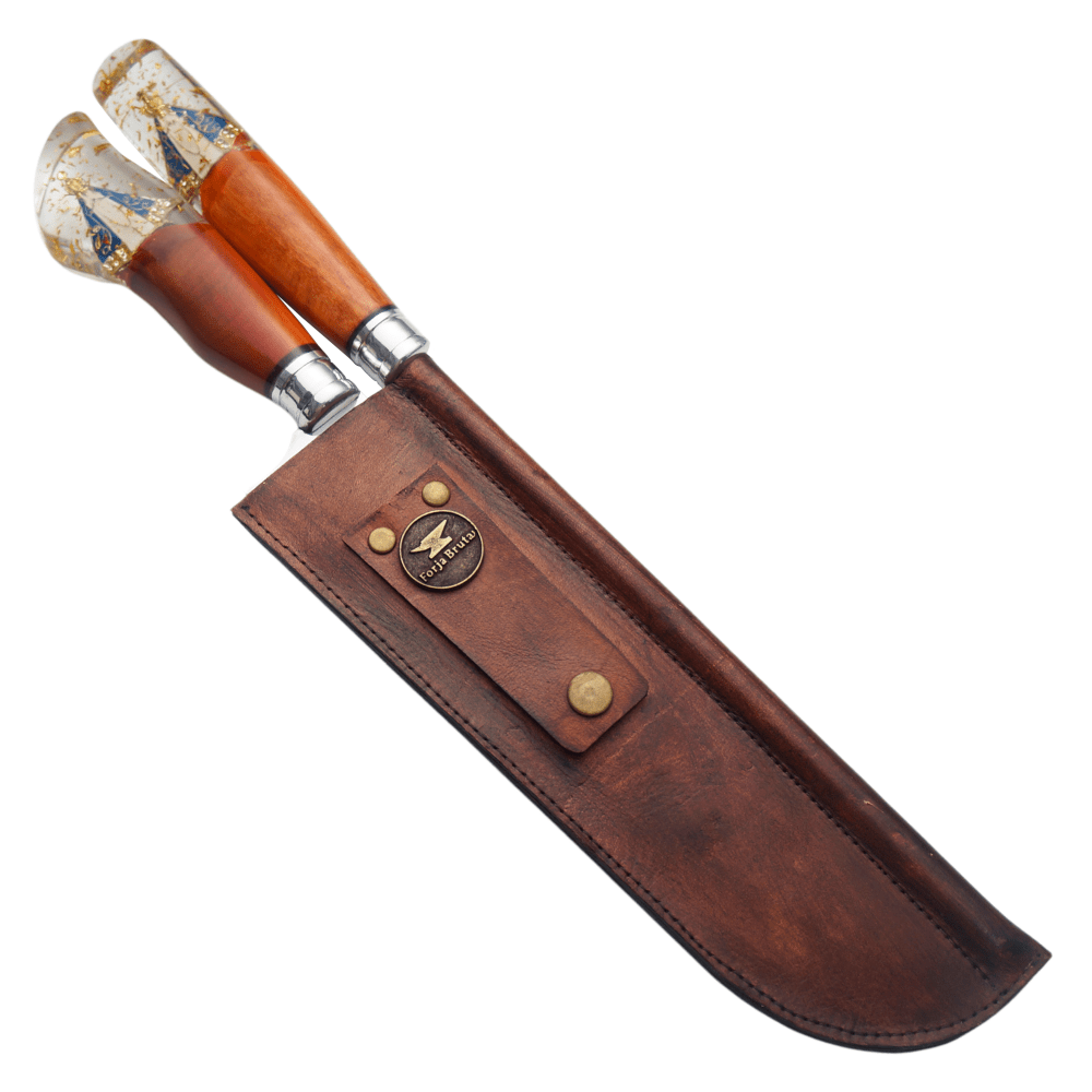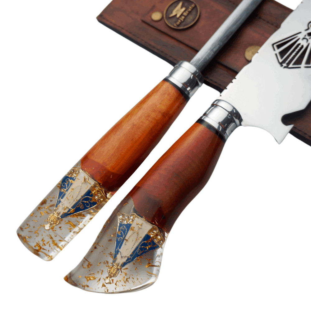 - Cabo: Resina artesanal com madeira nobre e detalhes em metal