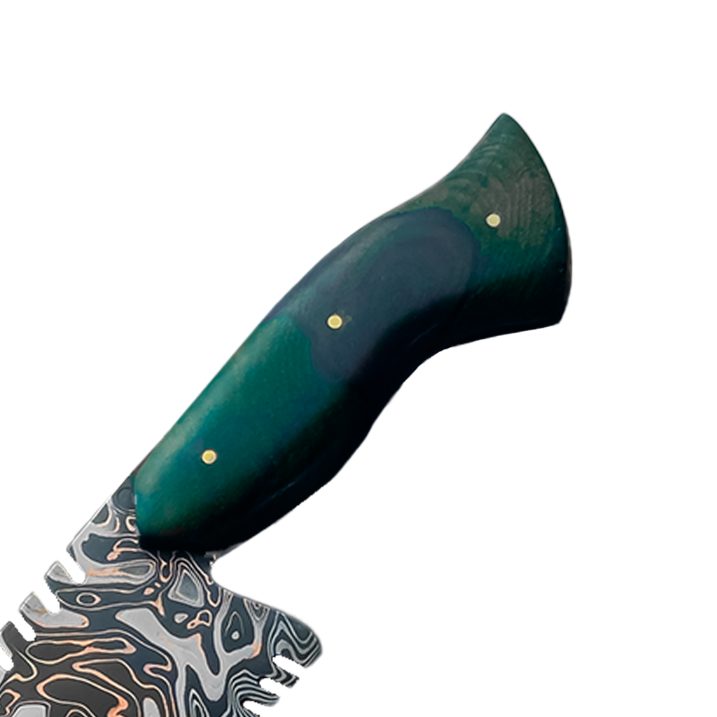 O cabo em resina estabilizada verde-azulado não é apenas visualmente impressionante - oferece aderência superior e durabilidade excepcional. Os rebites em latão complementam perfeitamente o visual robusto e sofisticado.